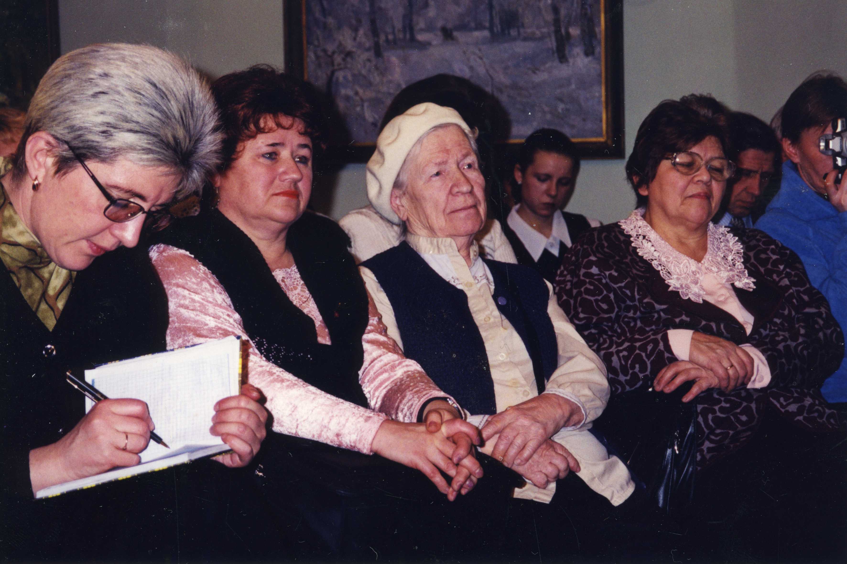 Стоят: журналист Надежда Козлова, неизв., неизв., Анна Константиновна Потылицына (жена Николая Ильича), Владимир Огородников, [Любовь Николаевна Ярославцева], Римма Астафьева.